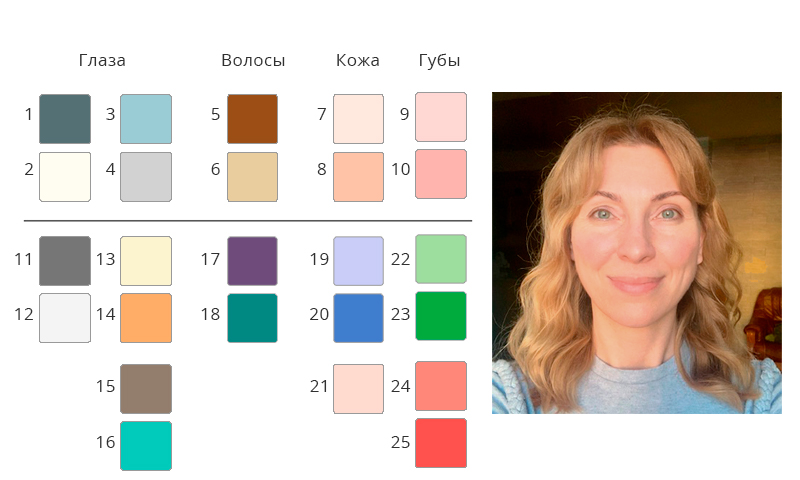 Я взяла фотографию лица при максимально естественном освещении без макияжа в высоком разрешении. Далее с помощью инструмента "пипетка" я нашла все основные оттенки, присутствующие в радужке глаз, в оттенке волос у корней и чуть дальше, а также в тоне лица. Кроме того, к каждому из этих оттенков я подобрала цвета-компаньоны и цвета-усилители. И вот что у меня получилось: